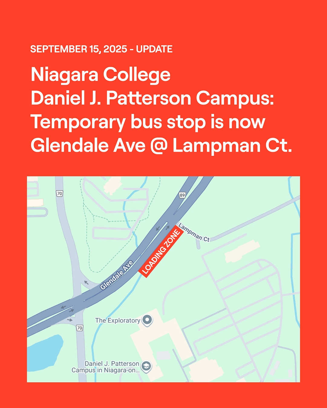 Due to labour disruption at Niagara College, bus service to all campuses has been temporarily changed.