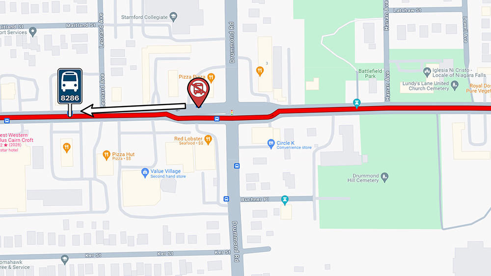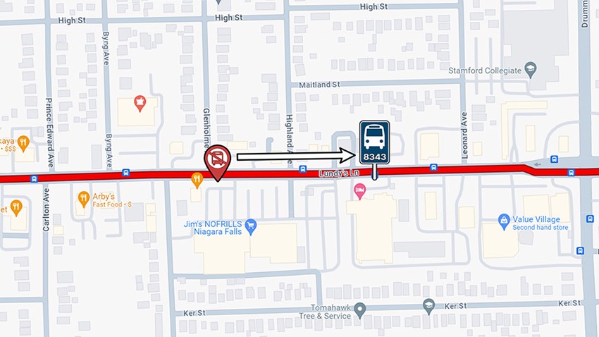 Both stops at Lundy's Lane & Royal Manor will be moved approximately 75 meters west, towards the QEW overpass bridge. The Lundy's Lane & Brookfield stop will be relocated about 70 meters west of its current position.